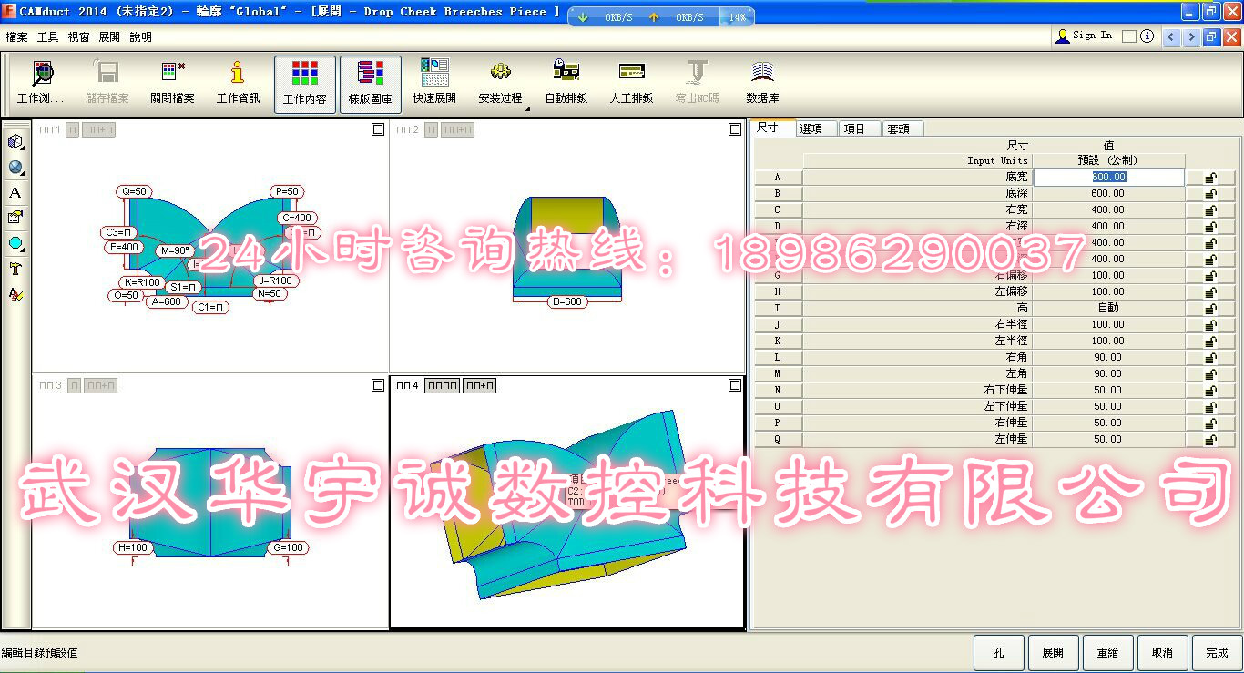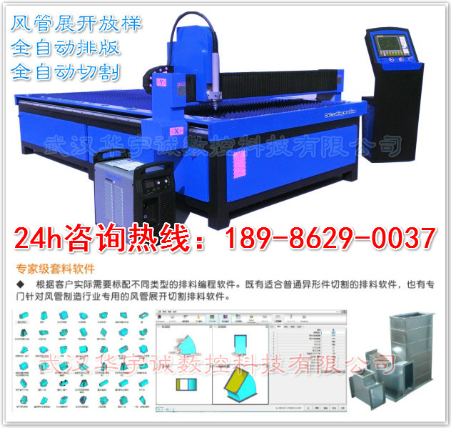 武漢華宇誠數控生產的風管等離子切割機,針對風管展開切割進行了專門優化。切割速度更快、切割精度更高、切割效果更好。并搭配專門的風管展開軟件,用戶只需選擇要切割的風管類型,輸入相應尺寸參數,便可自動排料、自動生成加工程序,用戶直接用U盤在切割機上調入加工程序切割即可。  適合材料有:不銹鋼板、碳鋼板、鋁板、銅板、鍍鋅板、白鐵皮、合金板等多種板材材料,一應俱全!高速等離子切割,切割效果為激光下限!