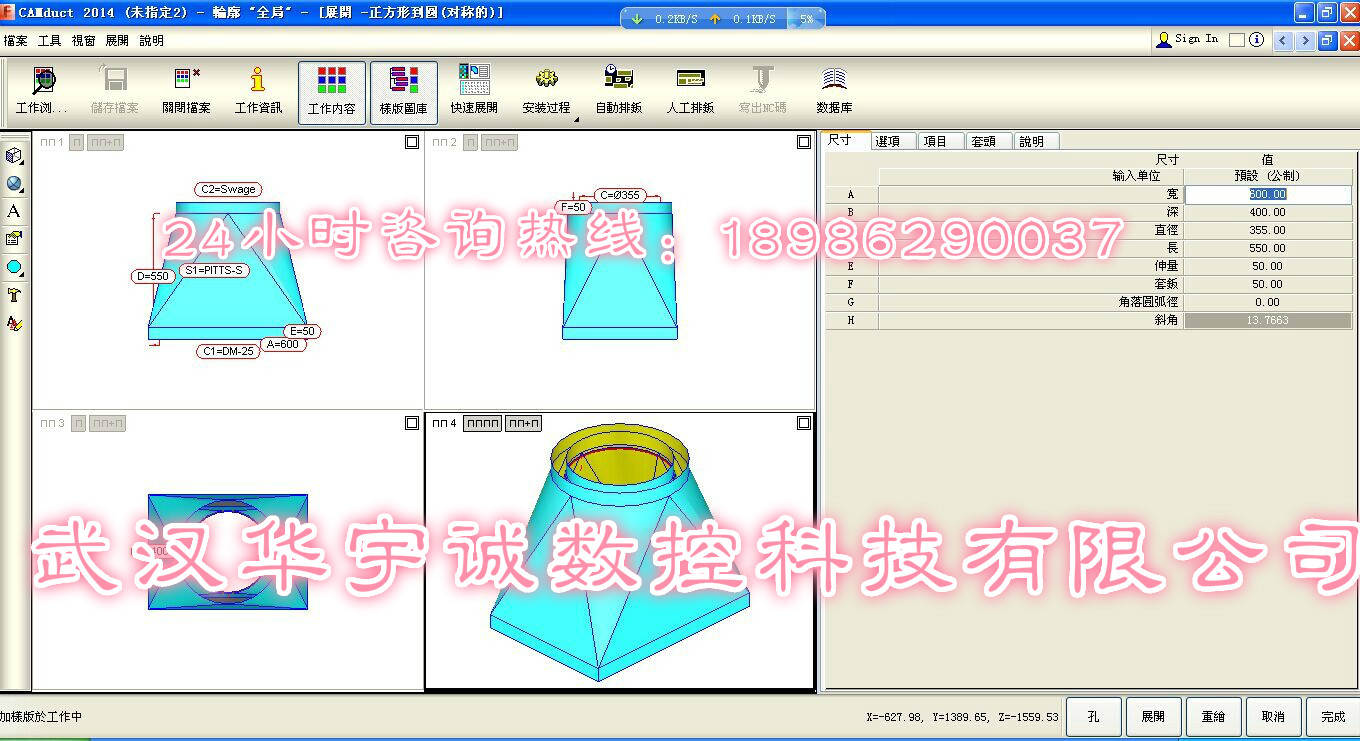 9、隨機(jī)配套提供風(fēng)管展開切割專用軟件,無需掌握復(fù)雜的繪制及計(jì)算。只需選擇相應(yīng)的風(fēng)管類型,輸入簡(jiǎn)單參數(shù)即可自動(dòng)生成加工程序進(jìn)行切割加工。